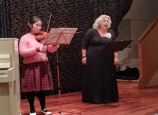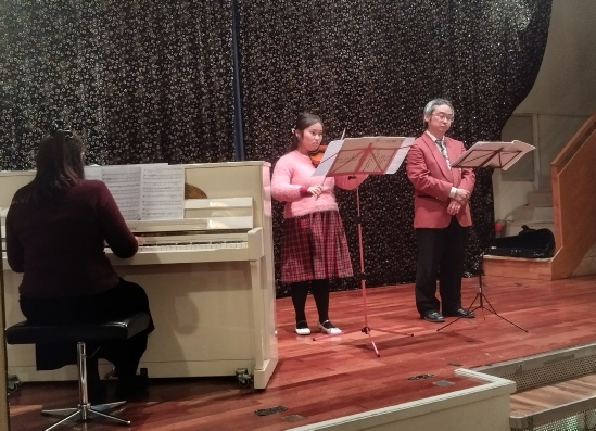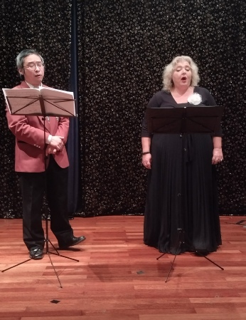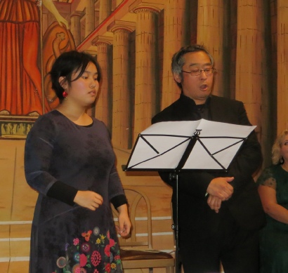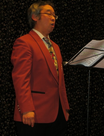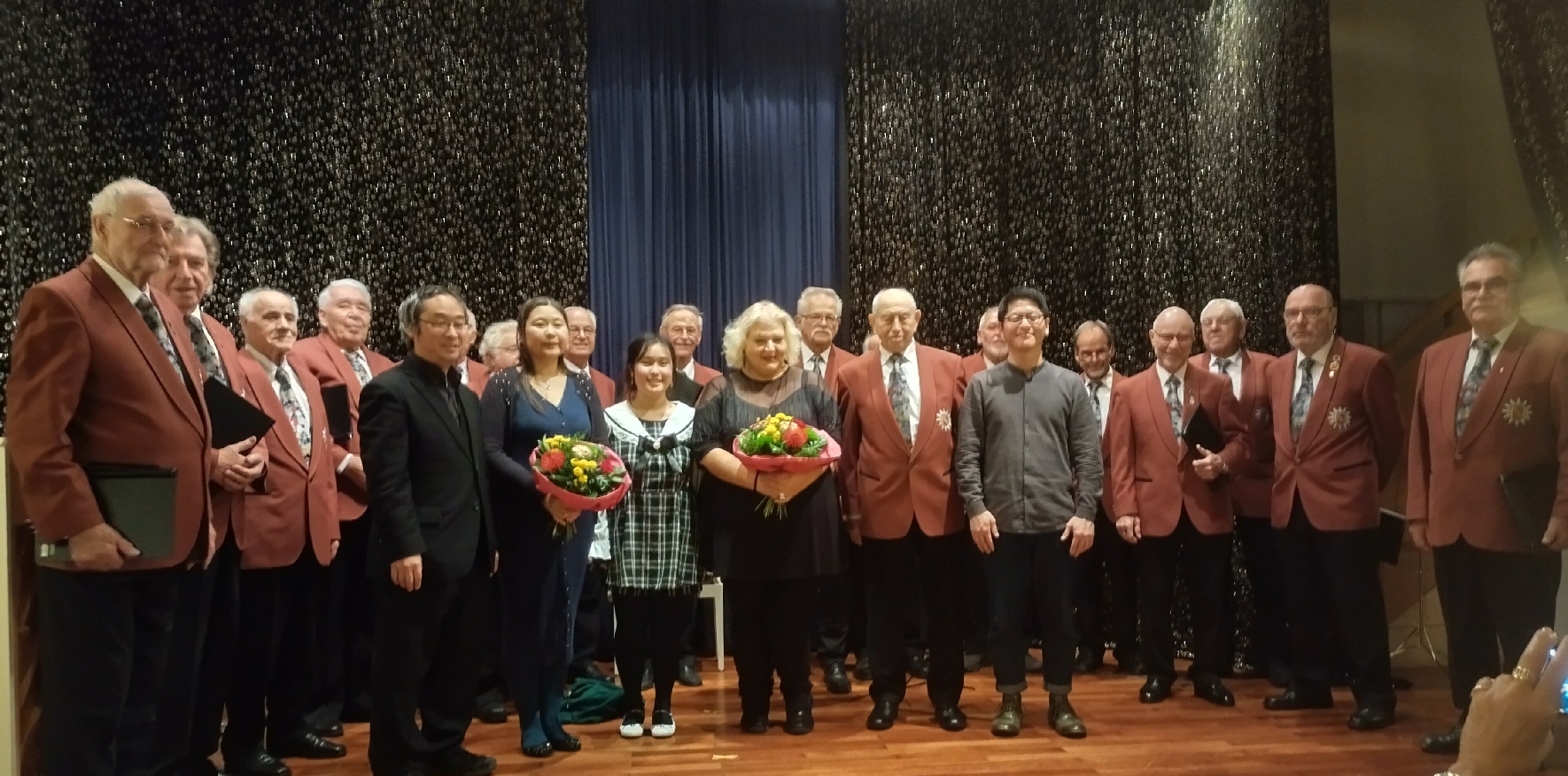 Danach begann der Polizeichor das Programm mit 3 Liedern, ehe die hervorragende Sopranistin Colette Sternberg, unser Chorleiter Makitaro Arima und dessen Tochter Momo teils gemeinsam oder als Solisten auftraten. Begleitet wurden sie von Reiko Emura, der Ehefrau von Makitaro Arima am Klavier. Anschließend beendete der Chor das hervorragende Programm mit weiteren 3 Darbietungen. Das begeisterte Publikum wurde dann selbst zum Akteur, als Abschluss wurde von allen das „Badnerlied“ gesungen, zudem sich alle von ihren Stühlen erhoben.